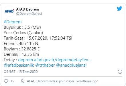 AFAD'dan alınan son dakika bilgisine göre, Çankırı'nın Çerkes ilçesinde 3.5 büyüklüğünde deprem meydana geldi.