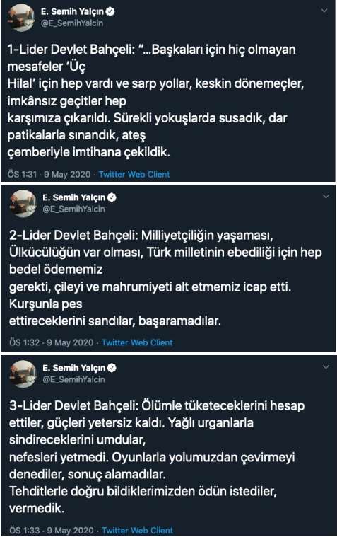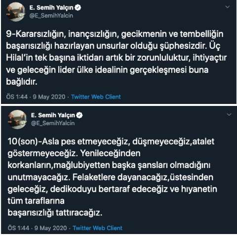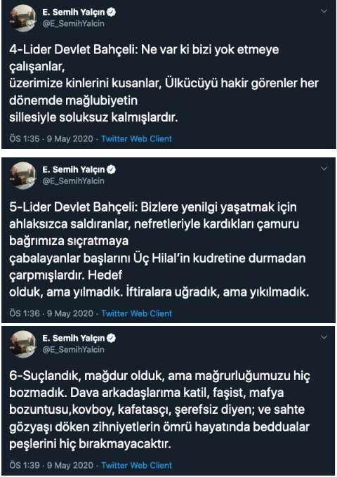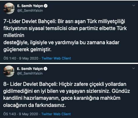 Milliyetçi Hareket Partisi (MHP) Genel Başkan Yardımcısı ve İstanbul Milletvekili Semih Yalçın kişisel twitter hesabından "TEK BAŞINA İKTİDAR" mesajı verdi. Yalçın MHP Lideri Devlet Bahçeli'nin sözlerini paylaştığı bir dizi tweet atarak açıklamalarda bulundu.