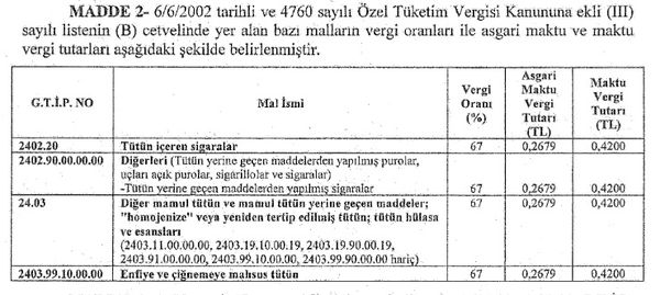 Sigaradan iki tür vergi alınıyor. Biri oransal diğeri asgari maktu vergi. Yılbaşında yapılan düzenleme ile oransal vergi yüzde 63'ten yüzde 67’ye çıkarılmıştı. Böylece pahalı sigaralardaki toplam vergi yükü artarak, bir paket sigara fiyatının yüzde 86’sına yükselmişti. Yani yeni vergi oranlarıyla; 11 liralık bir paket sigaranın 9 lira 50 kuruşu vergi olmuştu.