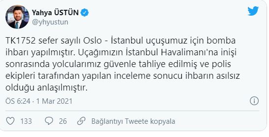 “TK1752 sefer sayılı Oslo-İstanbul uçuşumuz için bomba ihbarı yapılmıştır. Uçağımızın İstanbul Havalimanı'na inişi sonrasında yolcularımız güvenle tahliye edilmiş ve polis ekipleri tarafından yapılan inceleme sonucu ihbarın asılsız olduğu anlaşılmıştır."