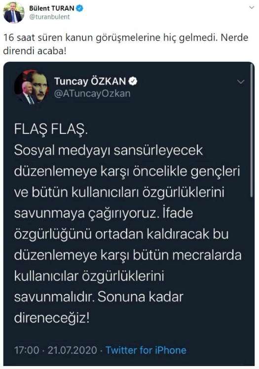 Turan Twitter hesabından paylaştıığı mesajda söz konusu düzenlemeye dair görüşmelerin 16 saat sürdüğününün altını çizerek Özkan'ın Meclis'te olmadığını şu mesajla ortaya çıkardı: "16 saat süren kanun görüşmelerine hiç gelmedi. Nerede direndi acaba?"