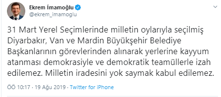 31 Mart Yerel Seçimlerinde milletin oylarıyla seçilmiş Diyarbakır, Van ve Mardin Büyükşehir Belediye Başkanlarının görevlerinden alınarak yerlerine kayyum atanması demokrasiyle ve demokratik teamüllerle izah edilemez. Milletin iradesini yok saymak kabul edilemez.