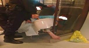 Saatlerce süren uğraşlar sonucu klozet yerinden söküldü ve genç adam hastaneye böyle kaldırıldı.