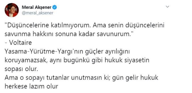 Mahkemenin verdiği kararın ise hukuksuz olduğunu ima eden Akşener, “gün gelir hukuk herkese lazım olur” ifadelerini kullandı.