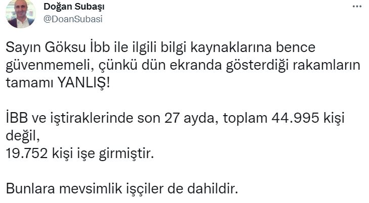 Subaşı, Göksu'nun iddia ettiği gibi İBB'ye 44.995 kişinin değil, 19.752 kişinin işe alındığını ifade etti.