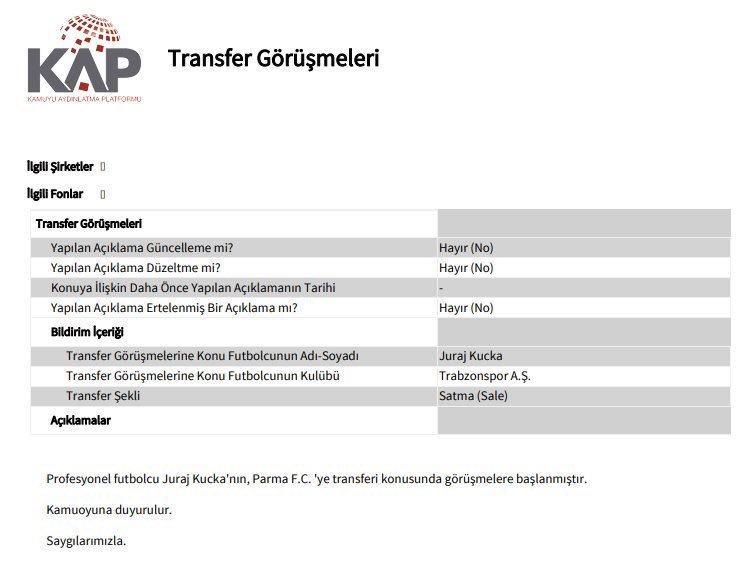 Trabzonspor, tecrübeli futbolcusu Juraj Kucka'nın transferi için İtalya'nın Parma kulübü ile görüşmelere başlandığını Kamu Aydınlatma Platformu'na bildirdi.