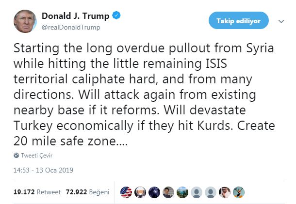 ABD Başkanı Trump, Türkiye'nin Suriye'de Kürtleri (PKK/YPG terör örgütlerini) vurması durumunda, Türkiye'nin ekonomisini mahvedeceklerini, yıkıma uğratacaklarını ve bölgede 32 kilometrelik güvenli bir bölge oluşturacaklarını ifade etti.