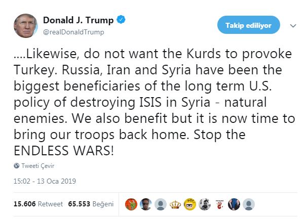 Aynı zamanda Trump, Kürtler'in de Türkiye'yi provoke etmesini istemediklerini kaydetti.