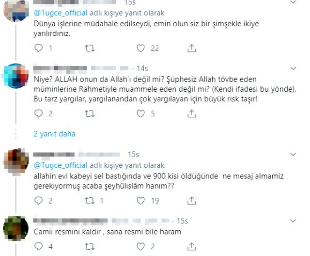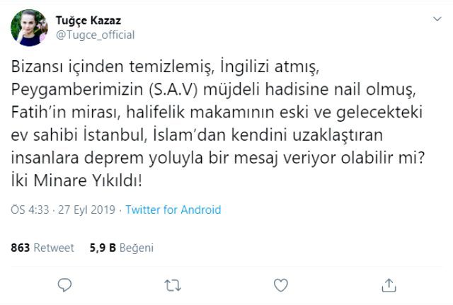 Kazaz, "Bizansı içinden temizlemiş, İngilizi atmış, Peygamberimizin (S.A.V) müjdeli hadisine nail olmuş, Fatih'in mirası, halifelik makamının eski ve gelecekteki ev sahibi İstanbul, İslam'dan kendini uzaklaştıran insanlara deprem yoluyla bir mesaj veriyor olabilir mi? İki Minare Yıkıldı!" paylaşımında bulundu.