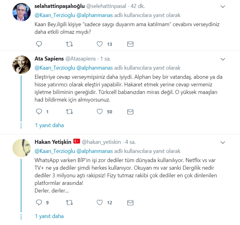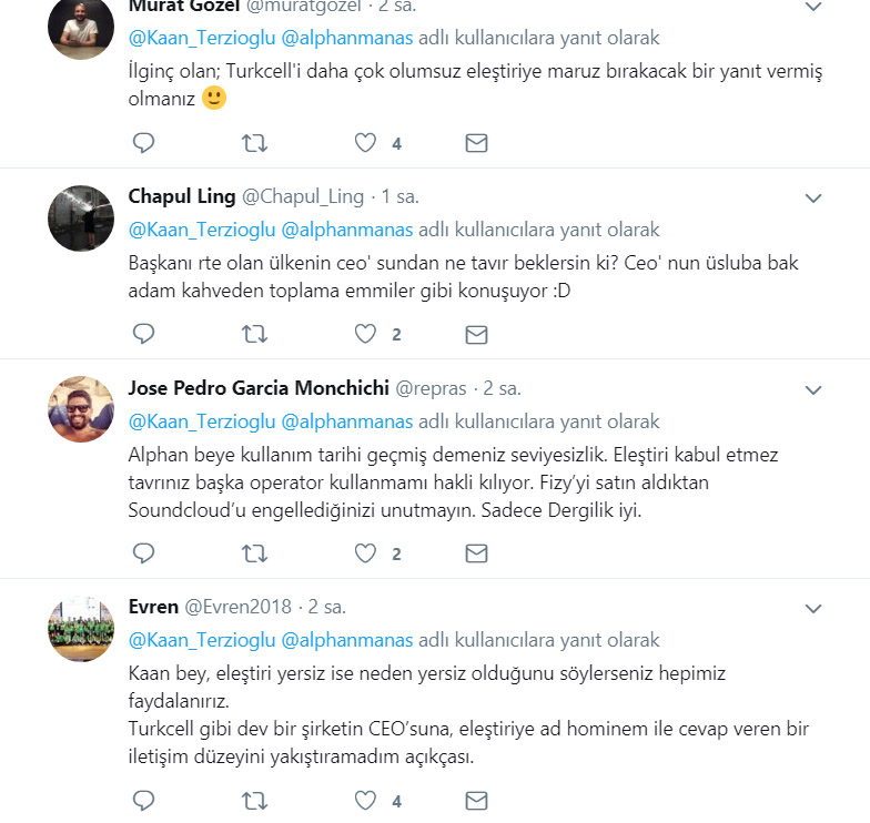 Sosyal medya kullanıcıları Turkcell Ceo'su Kaan Terzioğlu'nun girişimci Alphan Manas'a karşı kullandığı üslubunu eleştiri yağmuruna tuttu.