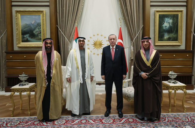Cumhurbaşkanı Recep Tayyip Erdoğan, Türkiye'ye resmi ziyarette bulunan Abu Dabi Veliaht Prensi Şeyh Muhammed bin Zayid Al Nahyan ile Cumhurbaşkanlığı Külliyesi’nde baş başa ve heyetler arası görüşme gerçekleştirdi.