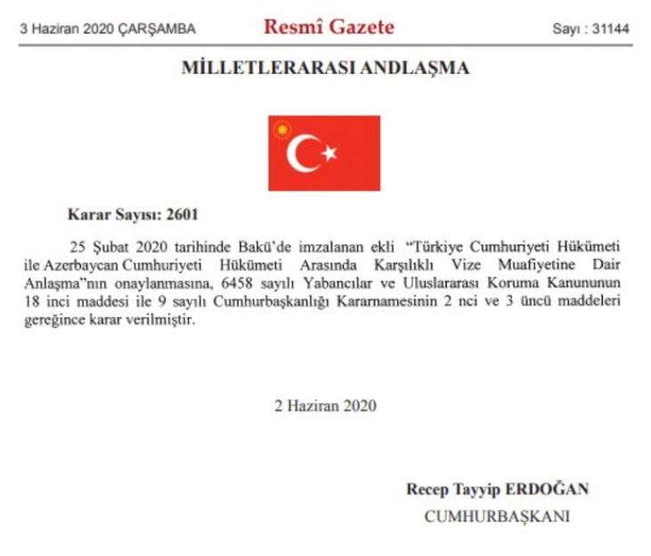 Resmi Gazete'nin bugünkü sayısında yayımlanan milletlerarası antlaşmaya göre, Türkiye ve Azerbaycan karşılıklı olarak vize uygulamasını kaldırdı. İşte haberin ayrıntıları;