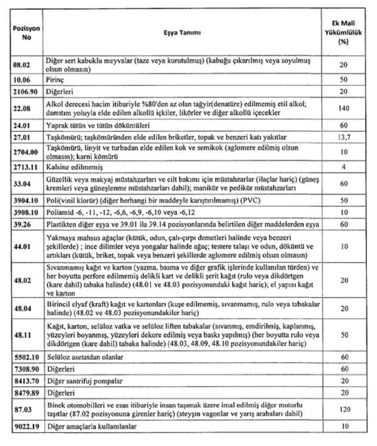 Diğer sert kabuklu meyveler (taze veya kurutulmuş, kabuğu çıkarılmış veya soyulmuş olsun olmasın) yüzde 20, pirinç yüzde 50, diğerleri yüzde 20, alkol derecesi hacim itibarıyla yüzde 80'den az olan tağyir (denatüre) edilmemiş etil alkol; damıtım yoluyla elde edilen alkollü içkiler, likörler ve diğer alkollü içecekler yüzde 140, yaprak tütün ve tütün döküntüleri yüzde 60, taş kömürü; taş kömüründen elde edilen briketler, topak ve benzeri katı yakıtlar yüzde 13,7, taş kömürü, linyit ve turbadan elde edilen kok ve semikok (aglomere edilmiş olsun olmasın); karni kömürü yüzde 10, kalsine edilmemiş yüzde 4, güzellik veya makyaj müstahzarları ve cilt bakımı için müstahzarlar (ilaçlar hariç, güneş kremleri veya güneşlenme müstahzarları dahil); manikür ve pedikür müstahzarları yüzde 60, poli (vinil klorür, diğer herhangi bir maddeyle karıştırılmamış, PVC) yüzde 50, poliamid -6, -11, -12, -6,6, -6,9, -6,10 veya -6,12 yüzde 10, plastikten diğer eşya ve 39.01 ila 39.14 pozisyonlarında belirtilen diğer maddelerden eşya yüzde 60, yakmaya mahsus ağaçlar (kütük, odun, çalı-çırpı demetleri halinde veya benzeri şekillerde); ince dilimler veya yongalar halinde ağaç; testere talaşı ve odun, döküntü ve artıkları (kütük, briket, topak veya benzeri şekillerde aglomere edilmiş olsun olmasın) yüzde 10, sıvanmamış kağıt ve karton (yazma, basma ve diğer grafik işlerinde kullanılan türden) ve her boyutta perfore edilmemiş delikli kart ve delikli şerit kağıt (rulo veya dikdörtgen -kare dahil- tabaka halinde), (48.01 ve 48.03 pozisyonundaki kağıt hariç); el yapısı kağıt ve karton yüzde 20, birincil elyaf (kraft) kağıt ve kartonları (kuşe edilmemiş, sıvanmamış, rulo veya tabaka halinde, 48.02 ve 48.03 pozisyonundakiler hariç) yüzde 20, kağıt, karton, selüloz vatka ve selüloz liften tabakalar (sıvanmış, emdirilmiş, kaplanmış, yüzeyleri boyanmış, yüzeyleri dekore edilmiş veya baskı yapılmış, her boyutta rulo veya dikdörtgen -kare dahil- tabaka halinde, 48.03, 48.09, 48.10 pozisyonundakiler hariç) yüzde 50, suni filament demetleri selüloz asetattan olanlar yüzde 60, diğerleri yüzde 60, diğer santrifüj pompalar yüzde 20, diğerleri yüzde 20, binek otomobilleri ve esas itibarıyla insan taşımak üzere imal edilmiş diğer motorlu taşıtlar (87.02 pozisyonuna girenler hariç, steyşın vagonlar ve yarış arabaları dahil) yüzde 120, diğer amaçlarla kullanılanlar yüzde 10. Bu kararın yayımı tarihinden önce Türkiye'ye sevk edilmek üzere bir taşıma belgesi düzenlenerek yüklemesi yapılmış eşyanın, bu kararın yayımı tarihinden itibaren en geç 45 gün içinde ithalatına ilişkin gümrük beyannamesinin tescili veya gümrük mevzuatı çerçevesinde özet beyanın verilmesi dahilinde, bu değişiklik kararından önceki ek mali yükümlülük oranları uygulanacak.