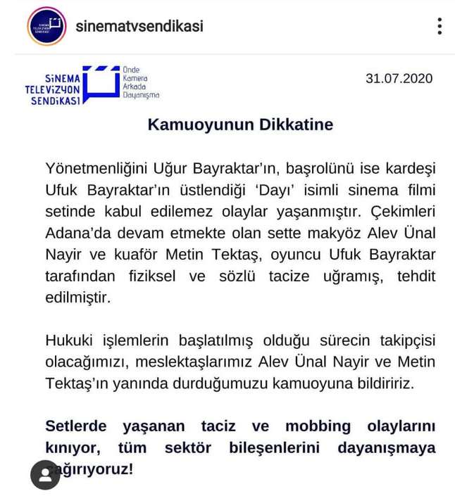 Sinema Televizyon Sendikası, bir açıklama yayınlayarak, makyöz Alev Ünal Nayır ve kuaför Metin Tektaş’ın Dayı filminin Adana’da gerçekleşen çekimleri sırasında Ufuk Bayraktar’ın fiziksel ve sözlü tacizine uğradığını belirtti. Sinema Televizyon Sendikası Nayır ve Tektaş’ın yanında olduklarını belirtirken, sektör bileşenlerini taciz ve mobbing karşısında dayanışmaya çağırdı.