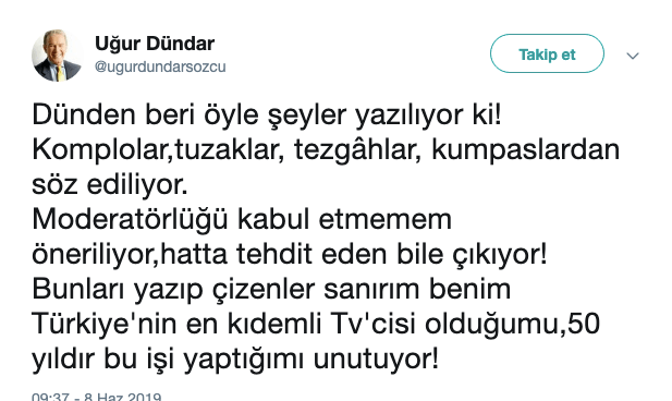 "Dünden beri öyle şeyler yazılıyor ki! Komplolar, tuzaklar, tezgâhlar, kumpaslardan söz ediliyor. Moderatörlüğü kabul etmemem öneriliyor hatta tehdit eden bile çıkıyor! Bunları yazıp çizenler sanırım benim Türkiye'nin en kıdemli Tv'cisi olduğumu,50 yıldır bu işi yaptığımı unutuyor!"