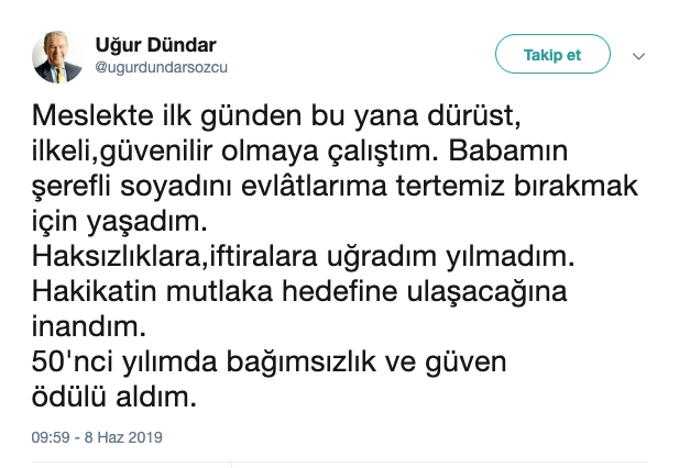 Dündar moderatör olmasını istemeyenlere yanıtını ise "Meslekte ilk günden bu yana dürüst, ilkeli,güvenilir olmaya çalıştım. Babamın şerefli soyadını evlâtlarıma tertemiz bırakmak için yaşadım. Haksızlıklara,iftiralara uğradım yılmadım. Hakikatin mutlaka hedefine ulaşacağına inandım. 50'nci yılımda bağımsızlık ve güven ödülü aldım." sözleri ile verdi.