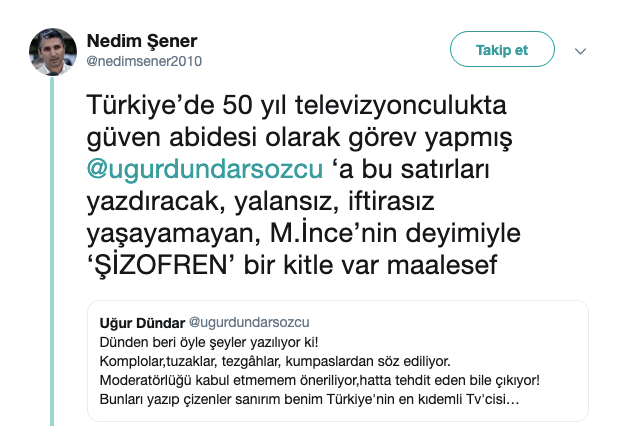 Gazeteci Nedim Şener de Uğur Dündar'a yönelik tehditlere sosyal medyadan "Türkiye’de 50 yıl televizyonculukta güven abidesi olarak görev yapmış @ugurdundarsozcu ‘a bu satırları yazdıracak, yalansız, iftirasız yaşayamayan, M.İnce’nin deyimiyle ‘ŞİZOFREN’ bir kitle var maalesef" sözleri ile tepki gösterdi.