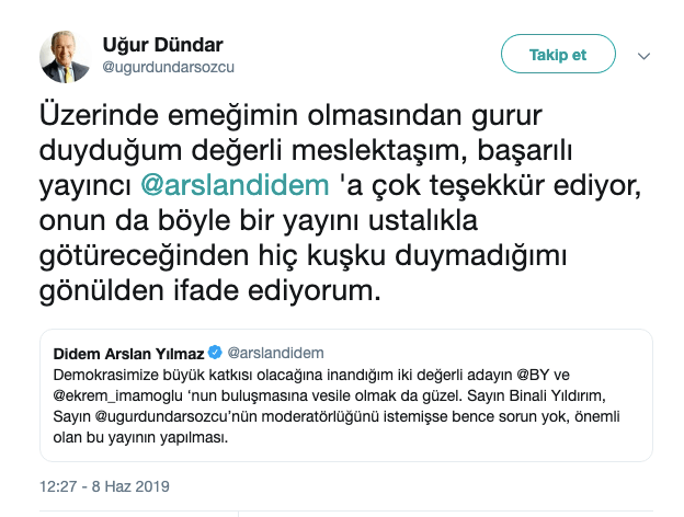 Binali Yıldırım'a canlı yayında yaptığı ortak yayın teklifi ile bugüne gelinmesini sağlayan Habertürk sunucusu Didem Arslan ise Dündar'a "Demokrasimize büyük katkısı olacağına inandığım iki değerli adayın @BY ve @ekrem_imamoglu ‘nun buluşmasına vesile olmak da güzel. Sayın Binali Yıldırım, Sayın @ugurdundarsozcu’nün moderatörlüğünü istemişse bence sorun yok, önemli olan bu yayının yapılması." sözleri ile destek verdi.