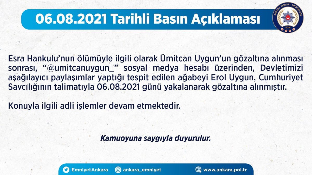''Esra Hankulu’nun ölümüyle ilgili olarak Ümitcan Uygun’un gözaltına alınması sonrası ‘@umitcanuygun_’ sosyal medya hesabı üzerinden, devletimizi aşağılayıcı paylaşımlar yaptığı tespit edilen ağabeyi Erol Uygun, Cumhuriyet Savcılığının talimatıyla 06.08.2021 günü yakalanarak gözaltına alınmıştır. Konuyla ilgili adli işlemler devam etmektedir.''