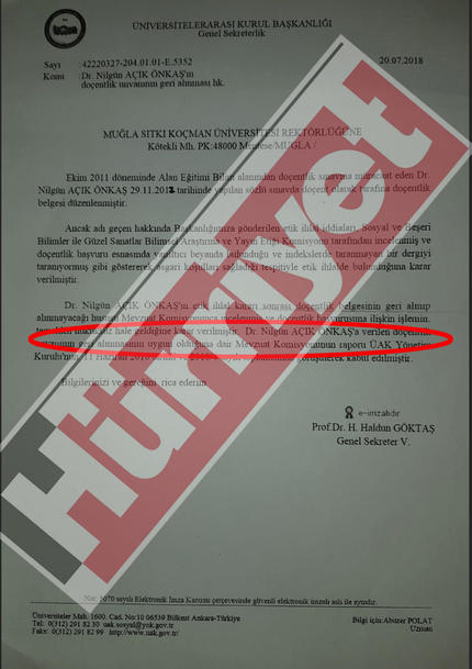 Kurul durumu, Türkiye'de doçentlik sınavı jürisini oluşturan Üniversitelerarası Kurul (ÜAK) Başkanlığı'na bildirdi. Kurul'a bağlı Mevzuat Komisyonu da durumu incelemeye aldı. Komisyon, Önkaş'ın doçentlik başvurusuna ilişkin işlemin hukuksuz hale geldiğini, doçentlik unvanının da geri alınması gerektiği yönünde görüş bildirdi. Komisyondan gelen rapor sonrası, ÜAK Yönetim Kurulu, geçen Haziran ayında, Önkaş'a verilen doçentlik belgesini geri alınmasına karar verdi. Kurul'un bu kararı, Muğla Sıtkı Koçman Üniversitesi Rektörlüğü'ne gönderildi.