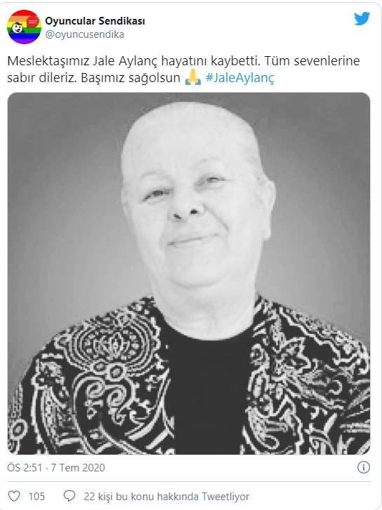 Unutursam Fısılda, İlk Öpücük gibi filmlerde, Dengi Dengine, Yeşil Deniz, Suskunlar gibi dizilerde rol alan Jale Aylanç, 72 yaşında hayata gözlerini yumdu. Oyuncular Sendikası, Aylanç’ın vefat ettiğini Twitter’dan duyurdu.