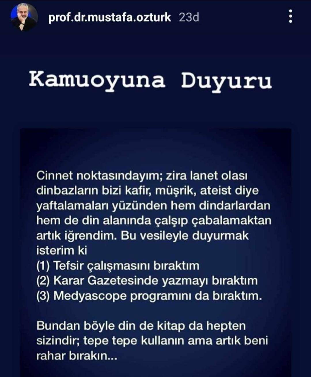 Instagram hesabından "Tefsir çalışmasını bıraktım. Karar gazetesinde yazmayı bıraktım. Medyascope programını da bıraktım" ifadelerini kullanan Mustafa Öztürk şu ifadeleri kullandı:
