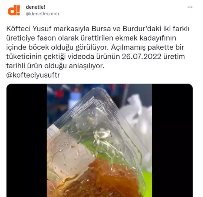 Söz konusu paylaşımda "Köfteci Yusuf markasıyla Bursa ve Burdur'daki iki farklı üreticiye fason olarak ürettirilen ekmek kadayıfının içinde böcek olduğu görülüyor. Açılmamış pakette bir tüketicinin çektiği videoda ürünün 26.07.2022 üretim tarihli ürün olduğu anlaşılıyor." ifadeleri kullanıldı.