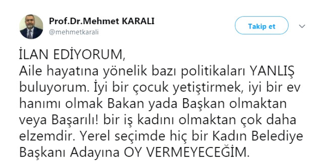 "İLAN EDİYORUM, Aile hayatına yönelik bazı politikaları YANLIŞ buluyorum. İyi bir çocuk yetiştirmek, iyi bir ev hanımı olmak Bakan yada Başkan olmaktan veya Başarılı! bir iş kadını olmaktan çok daha elzemdir. Yerel seçimde hiç bir Kadın Belediye Başkanı Adayına OY VERMEYECEĞİM."