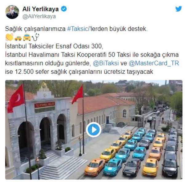 Sağlık çalışanlarımıza taksicilerden büyük destek. İstanbul Taksiciler Esnaf Odası 300, İstanbul Havalimanı Taksi Kooperatifi 50 Taksi ile sokağa çıkma kısıtlamasının olduğu günlerde, @BiTaksi ve @MasterCard_TR ise 12.500 sefer sağlık çalışanlarını ücretsiz taşıyacak.