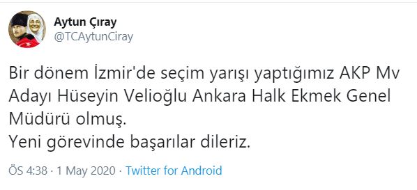 Çıray, “Bir dönem İzmir’de seçim yarışı yaptığımız AKP Mv Adayı Hüseyin Velioğlu Ankara Halk Ekmek Genel Müdürü olmuş. Yeni görevinde başarılar dileriz.” ifadelerini kullandı.