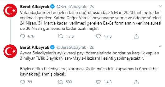 Bakan Albayrak, ''Vatandaşlarımızdan gelen talep doğrultusunda; 26 Mart 2020 tarihine kadar verilmesi gereken Katma Değer Vergisi beyanname verme ve ödeme süreleri 24 Nisan, 31 Mart’a kadar verilmesi gereken Ba-Bs formlarının verilme süresi de 30 Nisan gün sonuna kadar uzatılmıştır. Ayrıca Belediyelerin aylık vergi payı ödemelerinde borçlarına karşılık yapılan 3 milyar TL’lik 3 aylık (Nisan-Mayıs-Haziran) kesinti yapılmayacaktır. Böylece tüm belediyelere, koronavirüs ile mücadele kapsamında önemli bir kaynak sağlanmış olacak'' açıklamasını yaptı.