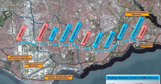 Öte yandan hattın metro istasyonları da belli oldu. Buna göre; Yenikapı, Kocamustafapaşa, Silivrikapı, Zeytinburnu, Osmaniye, İncirli, Adnan Kahveci, Siyavuşpaşa, Zafer Çobançeşme, Sefaköy istasyonları hatta yer alacak.