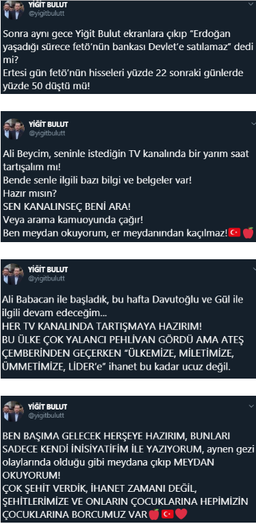 Bulut, "Ali Beycim, seninle istediğin TV kanalında bir yarım saat tartışalım mı! Bende senle ilgili bazı bilgi ve belgeler var! Hazır mısın? Sen Kanalın seç beni ara! Veya arama kamuoyunda çağır! Ben meydan okuyorum, er meydanından kaçılmaz" diye yazarken, "Ben başıma gelecek her şeye hazırım, bunları sadece kendi inisiyatifim ile yazıyorum" diye ifade etti.