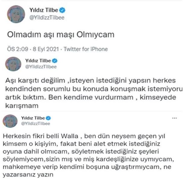 Sosyal medya hesabından sık sık yaptığı paylaşımlarla aşı olmayacağını söyleyen ve PCR testini de reddeden şarkıcı Yıldız Tilbe'nin fikrini değiştirdiği ve aşı olduğu gündeme gelmişti. Tilbe sosyal medya hesabından haberleri yalanladı.