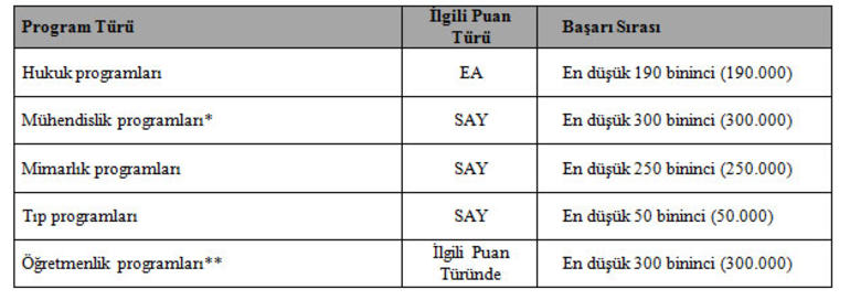 Açıklanan sınav sonuçları, kontenjanlar ve farklı puan türlerinde tercih hakkı kazanan öğrenci havuzunun genişlemiş olması durumu birlikte analiz edildi. Bu analizler sonucunda öğrencilerimizin lehine olmak üzere önceki yıllarda yürürlüğe konulan bazı programlara ait başarı sırası sınırlamalarının kalite önceliğimizden sarfınazar edilmeksizin genişletilmesi uygun görülmüş ve ilgili programların tercih edilebilmesi için gerekli olan asgari başarı sıralaması sınırları bu yıl için aşağıdaki şekilde belirlendi: