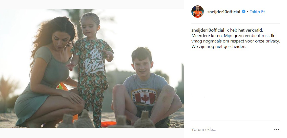 Sneijder, Instagram’dan yaptığı açıklamada, "Batırdım! Her şeyi batırdım. Hem de birçok kez. Ailem huzuru hak ediyor. Özel hayatımızın gizliliğine saygı duymanızı istiyorum. Henüz ayrılmadık" ifadelerini kullandı.
