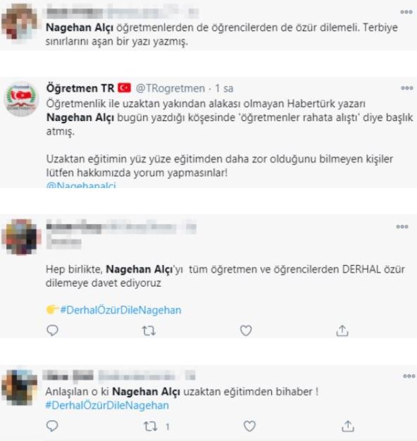 Habertürk yazarı Nagehan Alçı, 'Okulları kapalı tutarak bir nesli mahvetmek üzereyiz' başlığıyla yayımlanan yazısında "Öğretmenler de öğrenciler de okulsuzluğa, rahata alıştı sanki. Hakikaten isyan ediyorum. Okulları açmaya ne zaman öncelik vereceğiz?" dedi.